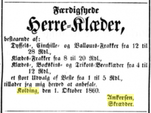 Annonce for "færdigsyede herre-klæder" fra skrædder Ankersen i Kolding. Bragt i avisen Dannevirke, 11. oktober 1860.