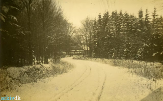 arkiv.dk beskrivelse: Nørre Bramdrup. Postkort med snedækket Bramdrupskovvej set fra "Bøgelund" mod Bramdrup Skovkro. Stemplet og dateret d. 24. januar 1921