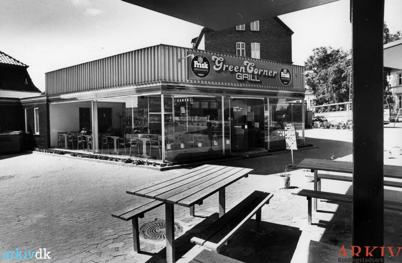 Beskrivelse: Green Corner Grill Fredericiagade 42, august 1983, havde tidligere huset en BP Tankstation. Hjørnet af Mazantigade/Fredericiagade.