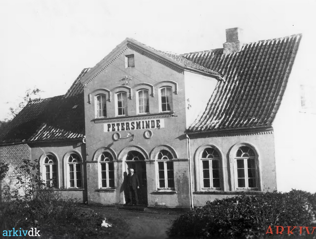 arkiv.dk beskrivelse: Kolding. Fynsvej. Udflugts- og badeetablissementet 'Petersminde'. Det er muligvis indehaveren siden 1878, Hans Nielsen (1842-1924), der står foran bygningen. Der var tale om et meget søgt udflugts- og badeetablissement, som lå omtrent, hvor den første "Svineryg" forbandt Nordre Havnevej med Fynsvej. Langs jernbanelinjen førte en cykel- og gangsti ud til badeanstalten "Lille Petersminde". Herudover var der også keglebane på stedet. Stedet lukkede i 1918-1919.