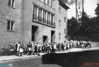 B476 - Skoleundervisning på biblioteket, 1944, ukendt fotograf Kolding. Besættelsen. Skolepiger i kø i Fredericiagade foran indgangen til Centralbiblioteket. Elever fra de beslaglagte skoler modtog bl.a. undervisning på biblioteket og i Kvindernes Bygning. I april 1945 blev undervisningen i en periode afbrudt pga. manglen på beskyttelsesrum i nærheden. https://arkiv.dk/vis/2226485